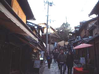 | さすがに清水寺付近は人が多い! 三年坂を登って行くのに、人とのすれ違いが大変で、急いでいるのに進めない。 両脇のお土産やさんも見たいけど、あとにして、ひたすら清水寺へ!! 急ぎながら撮った三年坂。→ |