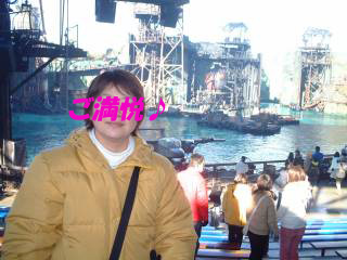 | 「ウォーターワールド」のショーもお勧め。 びっしょりと濡れたい人は最前列に座ってくださいね。水をバケツでぶっかけられます(笑)。 冬でも容赦しません(爆)。 私たちは遠慮して安全なエリアで鑑賞。 素敵なショーでした。 鑑賞後の私。 |