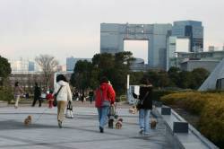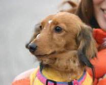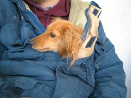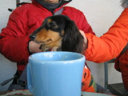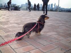 | ひとまず、アクアシティに避難。 中は暖かかったけど、wanが入れる所は外のテラスしかなくて、寒いけどまた外に行きました。 暖かい飲み物を飲んで、おしゃべり開始! あんずもくるみも冷たい雪に濡れて、寒くて震えていました。 くるみは、とんさんが懐にいれてあげるとうとうと寝始めてしまいました。 |
