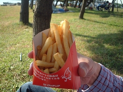 | 本日のランチはロッテリアのハンバーガー。 普段ファーストフードを食べないせいなのか、それとも空腹だからなのか・・・。 「すんごくおいしかった!!」 くるみにポテトを盗み食いされるという事件に合いながら、完食。 |