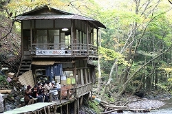| マイナスイオンたーーーーっぷり。 ひんやりと気持ちいい渓流沿いを歩きます。 寄り道しながら、徒歩10分ぐらいで、お待ちかねの草団子の小屋が・・・うわぁ・・・古・・・。 宮崎駿監督のアニメに出てきそうな、立派な建物。 築120年たっているという話。 いい雰囲気だった! |